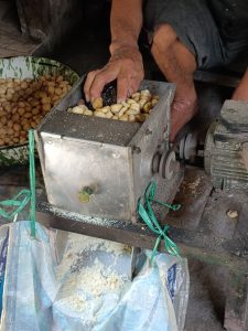 Buah kemiri yang dipungut adalah buah kemiri yang kulitnya sudah membusuk dan cangkangnya sudah terlihat. Setelah dipungut, buah kemiri biasanya dijemur terlebih dahulu sebelum dipisahkan antara isi dan cangkangnya. Dulu, buah kemiri hanya dijemur di atas seng selama beberapa minggu bahkan beberapa bulan, hingga cangkang kemiri pecah. Setelah cangkang kemiri pecah, biji kemiri bisa dipisahkan dengan mudah dari cangkangnya. Proses penjemuran dan pemecahan cangkang bisa dilakukan sendiri, atau di-pasuh ke jasa pemecah kemiri. Harga biji kemiri saat ini cukup tinggi, yaitu sekitar Rp 55.000 per kilogram. Selain prosesnya yang lama, biasanya dari sekitar 90 kg kemiri cangkang hanya akan dihasilkan sekitar 25 kg biji kemiri.
