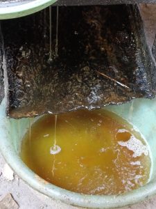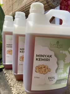 Meskipun proses pembuatan minyak kemiri tergolong sangat sederhana, tetapi memerlukan waktu yang cukup panjang dan lama. Untuk menghasilkan 15 liter minyak kemiri dibutuhkan 25 kg biji kemiri yang diproses selama tiga hari. Pertama, biji kemiri dihaluskan menggunakan mesin pemarut khusus, kemudian dikukus selama sekitar 40 menit. Setelah dikukus, kemiri diperas menggunakan alat pemeras khusus hingga mengeluarkan minyak. Sebelumnya kemiri kukus dibungkus dulu dengan kain agar lebih mudah diperas dan hasilnya maksimal. Proses pemerasan inilah yang memerlukan waktu yang cukup lama, hingga tetes terakhir.